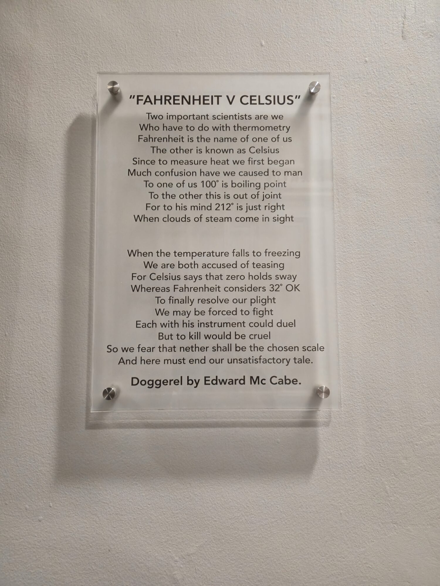 The weather in Ireland was amazing for August and was a topic of every conversation. Constantly reminding myself of the centigrade and fahrenheit conversion was annoying more than confusing. So when I saw this (see attached) on the walls, it really spoke to me. The title Fahrenheit vs Centigrade was enough to catch my attention but the poetry definitely made my day.