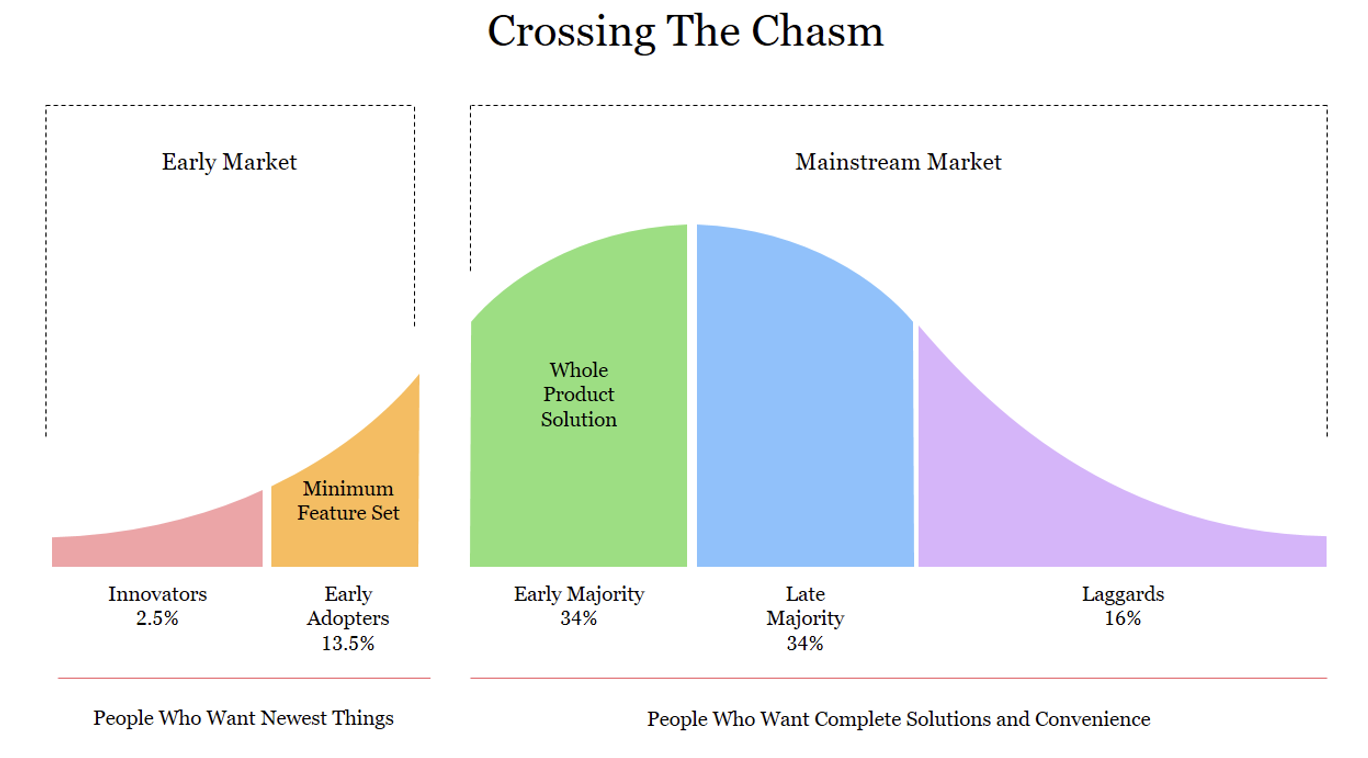 While the direct primary care movement has made huge strides over the last decade, it still sits firmly in the early adoption phase of the Technology Adoption Curve (see below). We are nowhere near crossing the “chasm” into the early majority. Current estimates suggest that roughly 5% of primary care is delivered through the DPC model. Even so, growth over the past 10 years has been tremendous, according to the American Academy of Family Physicians. Still, only a small portion of the population uses—or even knows about—DPC.
