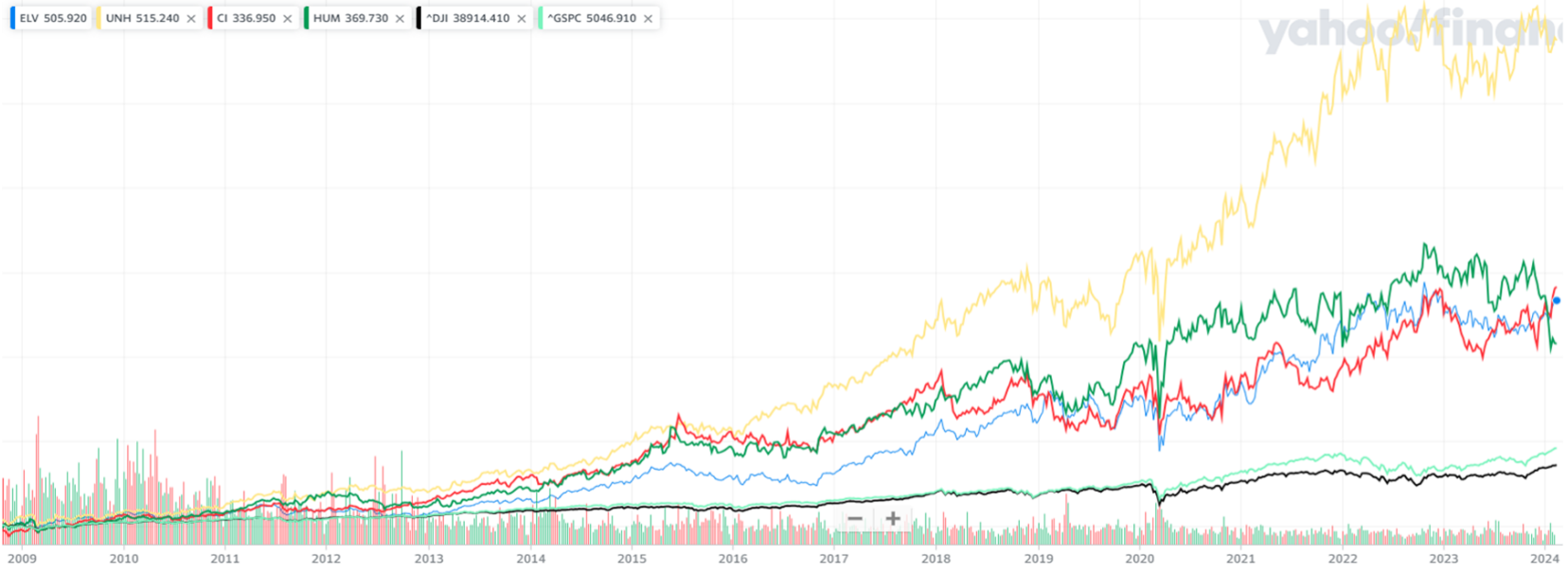 So, this chart should adequately prove that the BUCAs’ only allegiance is to their shareholders. In case the legend is too small, the blue line represents Elevance (BCBS plans across the country), the yellow line represents United Healthcare, and the red line represents Cigna. The green line represents Humana (no longer in the employer market), and the black line is the Dow Jones Industrial Average for comparison.