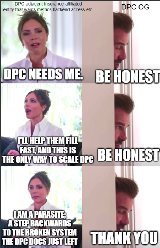 Notice that I didn’t throw every DPC-adjacent insurance-affiliated entity (PCMO, etc.) under the bus, here. Models are emerging that save employers a bundle and include DPC fees in the premium, which saves employers/employees money…by taxes…or by carrying the one if it’s a Thursday during a full moon, vis-a-vis leveraging the interest on a non-conformative-premium-infused-synergistic self-funded ERISA-compatible ACA-compliant double-secret policy…or something…in theory.