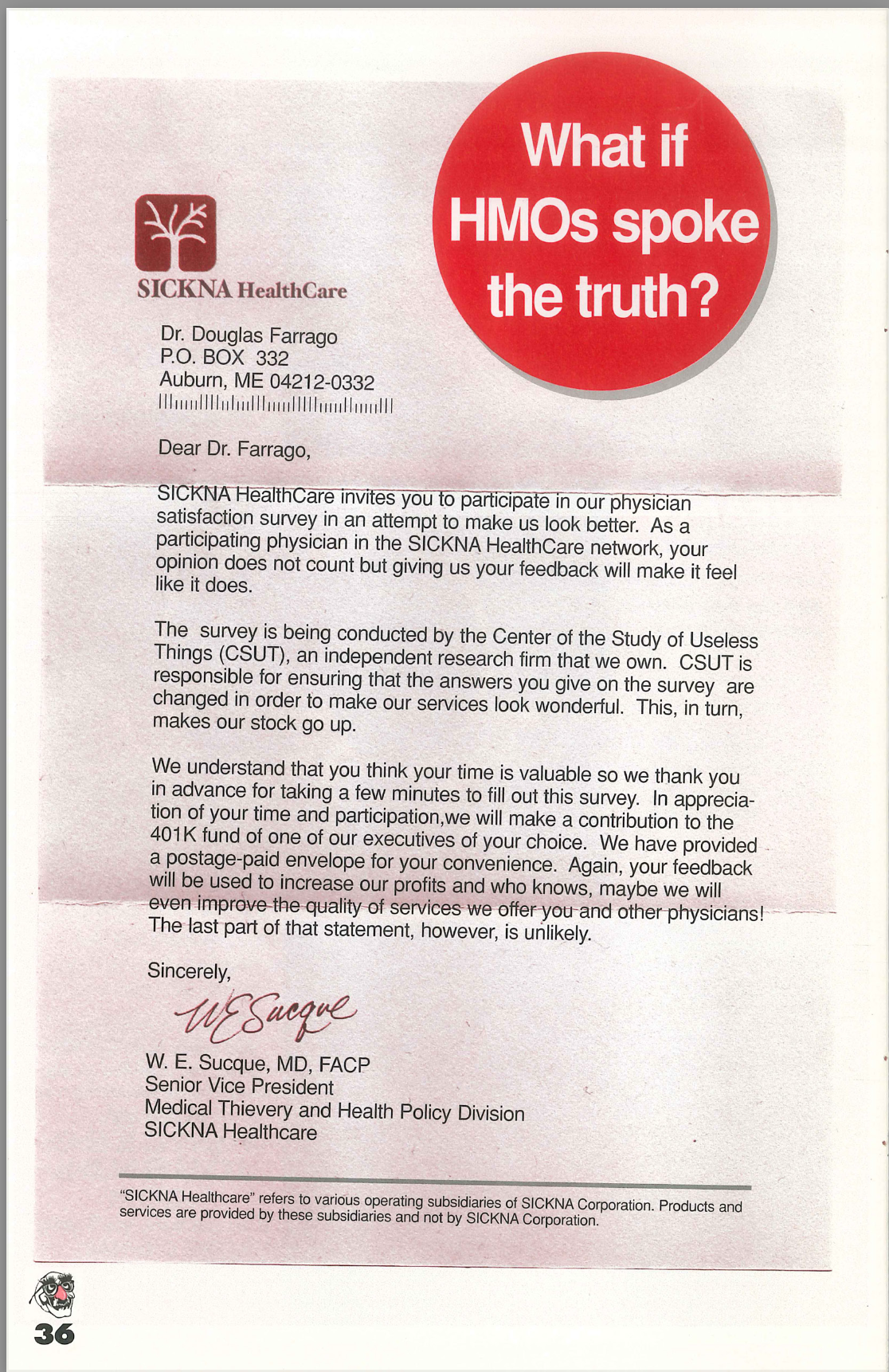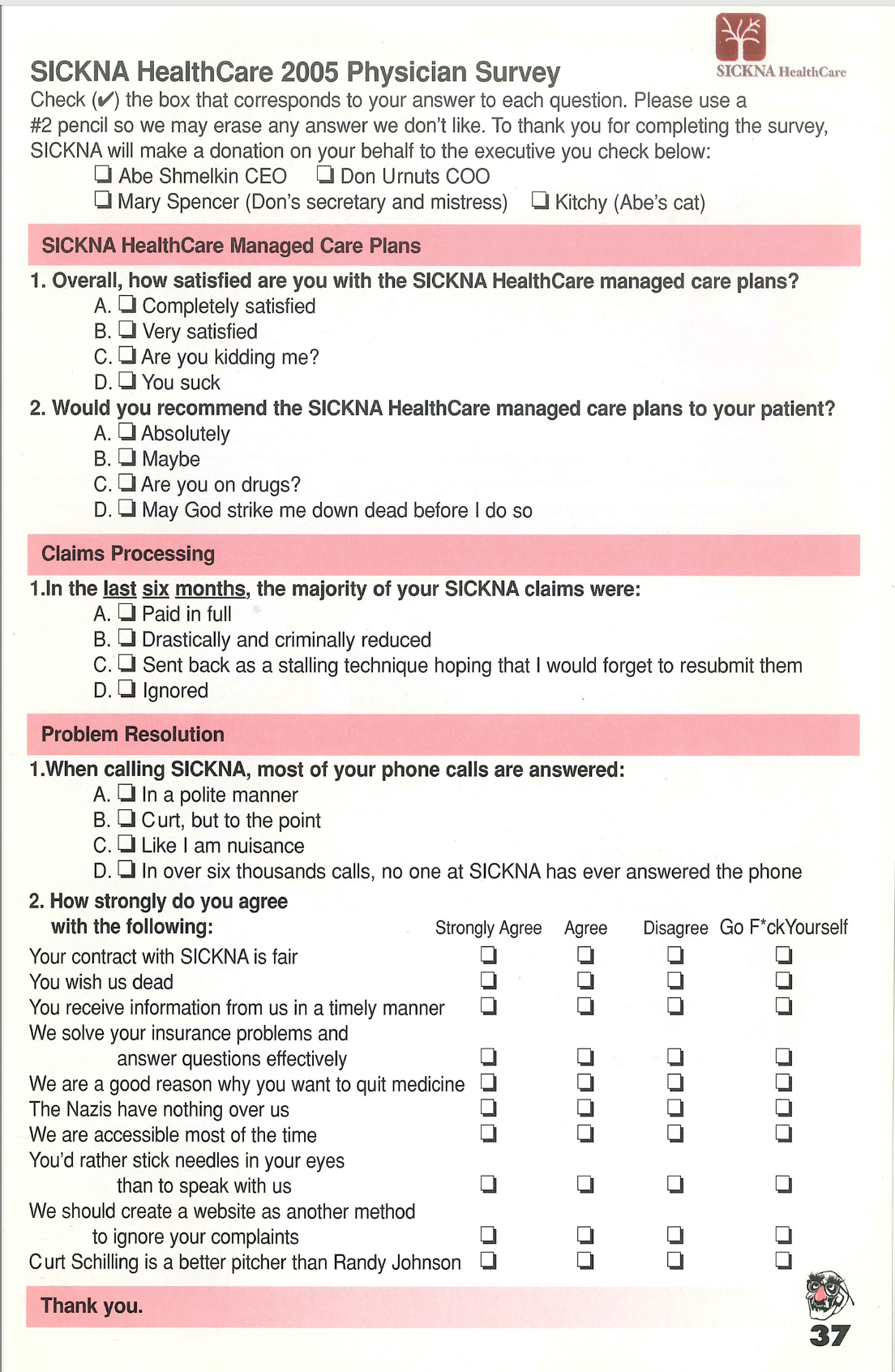 This was from years ago when I was going after Cigna via the Placebo Journal. You can read more about it here and how they tried to get me fired from my hospital. I made this because they actually sent out a satisfaction survey to doctors which we knew they never would release the results. And they didn’t. This stuff still continues today. The more things change the more they stay the same.