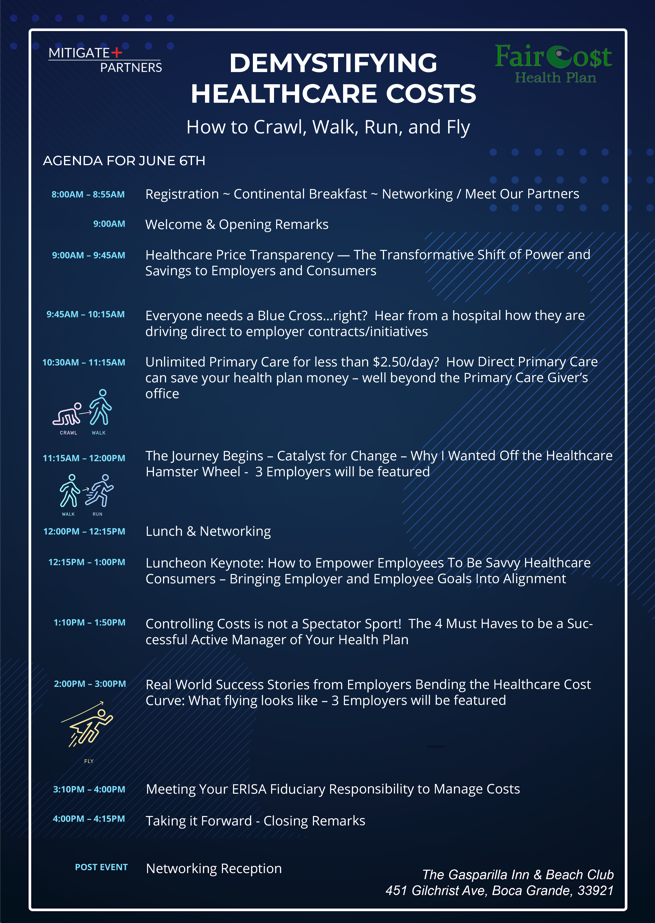 Mitigate Partners has been a big advocate for DPC. Every year they put on a big conference to sell employers on it. Check out the agenda below to learn more about them on June 6th as a live simulcast from the Mitigate Partners national conference in Boca Grande, FL. called 3rd Annual Mitigate Partners June 6th – DEMYSTIFYING HEALTHCARE COSTS – Controlling Costs is not a Spectator Sport! How to Crawl, Walk, Run, and Fly on Monday, June 6th, 2022 at The Gasparilla Inn Beach Club | 8:00 A.M – 5:00 P.M. in beautiful Boca Grande, Florida. Below are the links to register for this event along with the Agenda and brief video about the event. Learn more about the strategies that these national thought leaders use when actively managing benefit plans that directly impact a business’s bottom-line. If you can’t be in person then feel free to watch virtually and tune in to the specific topics that interest you.