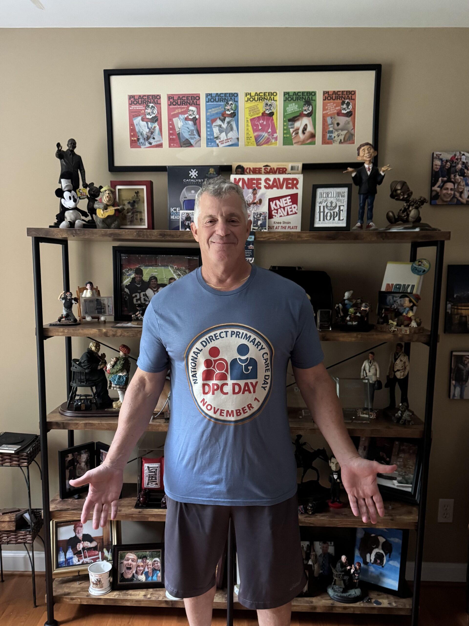 Here is a picture of me wearing the DPC Day shirt (I should have ironed it but I took it right from the package). My hope is that people buy this and wear it on November 1st while making a social media video about DPC Day. If you want to get them early and wear them at the DPC Summit then you need about 3 weeks to have it in time because this is print-on-demand.