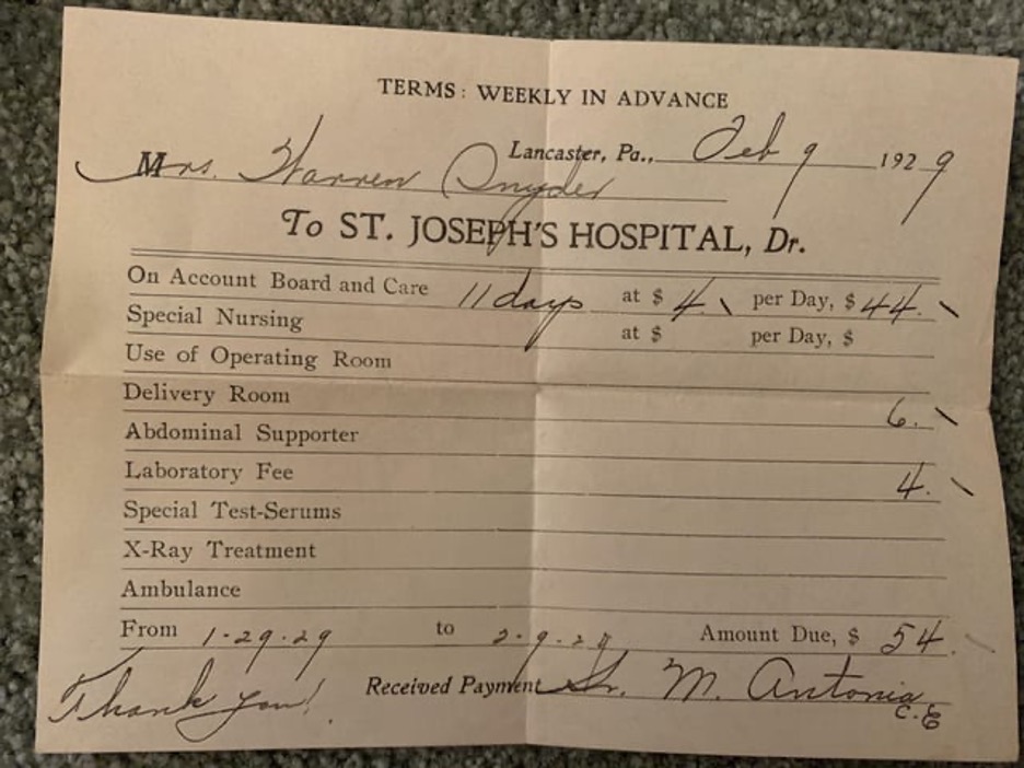 For reference on in-patient hospital pricing, I found a $54 hospital bill from 1929 for a birth which included an 11-night stay. The per day “Board and Care” rate was $4/day with itemizations of $6 “Delivery Room” and $4 “Laboratory Fee”. In today’s dollars that would be $992.13 for childbirth including an 11-night hospital stay.