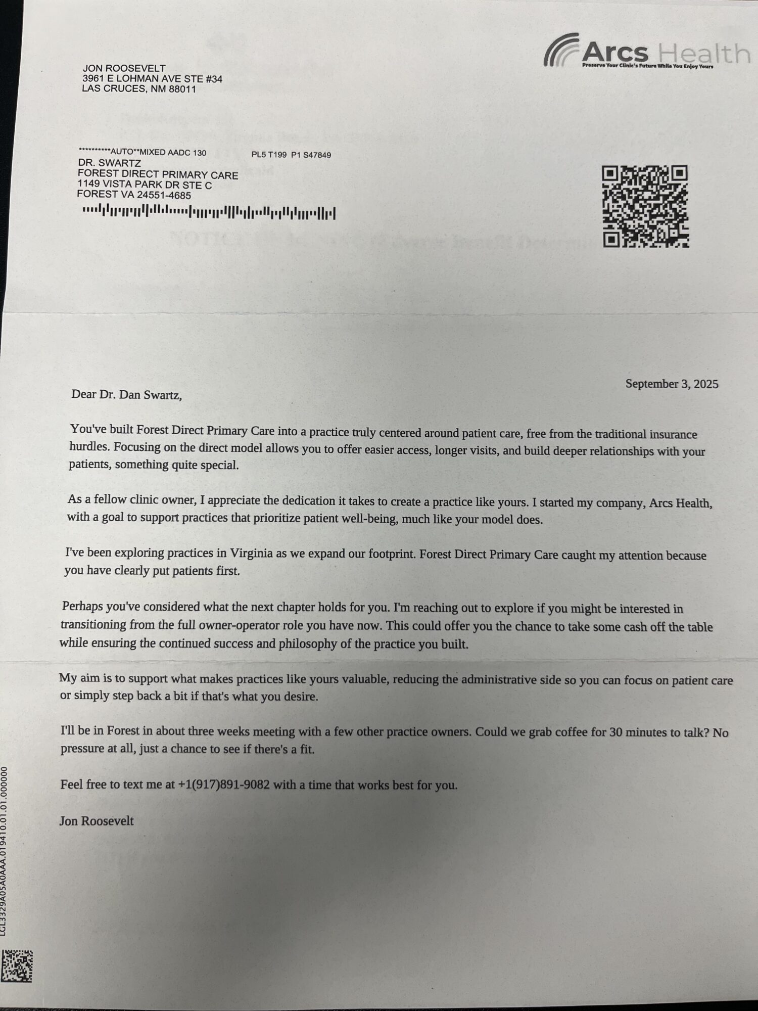 This is Jon Roosevelt. Not for certain, but pretty sure he is not from the famous Roosevelt family. Here is his website: https://jonroosevelt.com. Per LinkedIn: “Urgent Care Operator & Acquisition Expert | Founding Director @ Arcs Health | Partnering With Practice Owners: 60% Liquidity + 40% Retained Ownership.”