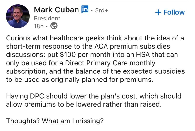 Mark Cuban has been active in the DPC and cash pay space recently. I wrote these 20 truths of DPC on LinkedIn to give him a quick rundown. These are points I think anyone new to DPC should know and are based on a decade worth of experience in the space.