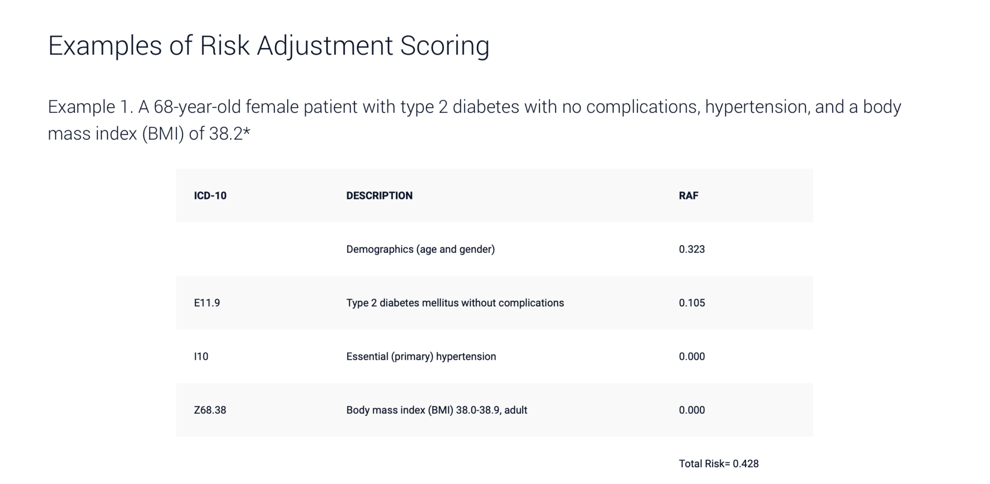 - HCC coding relies on ICD-10-CM coding to assign risk scores to patients. Each HCC is mapped to an ICD-10-CM code. Along with demographic factors such as age and gender, insurance companies use HCC coding to assign patients a risk adjustment factor (RAF) score. Using algorithms, insurance companies can use a patient’s RAF score to predict costs. For example, a patient with few serious health conditions could be expected to have average medical costs for a given time. However, a patient with multiple chronic conditions would be expected to have higher health care utilization and costs.