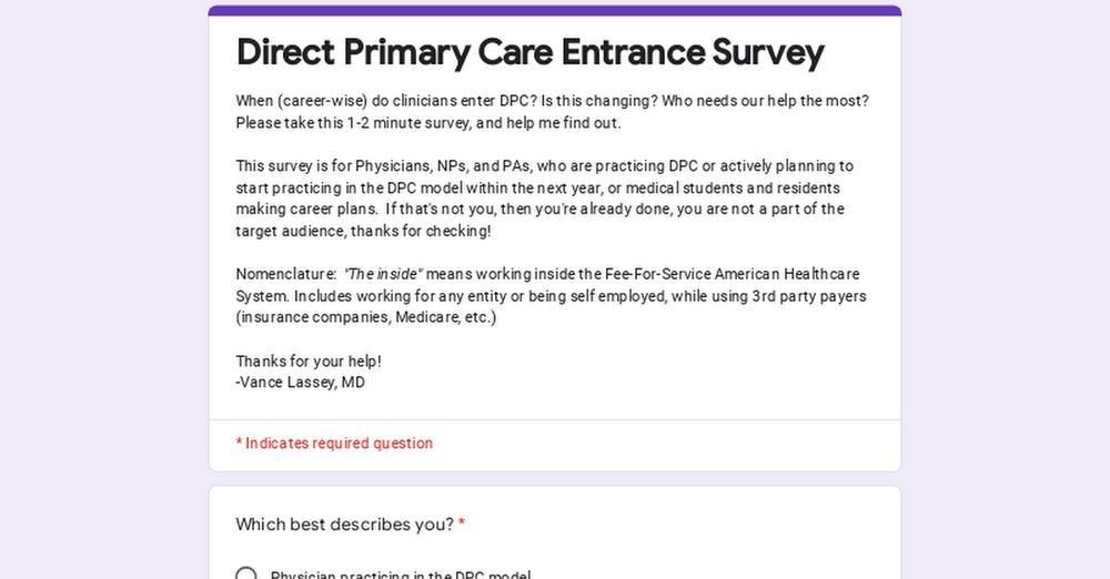 Continue readingI’m working on a little research project. This is a survey for DPC docs, DPC-interested students/residents, and docs on the