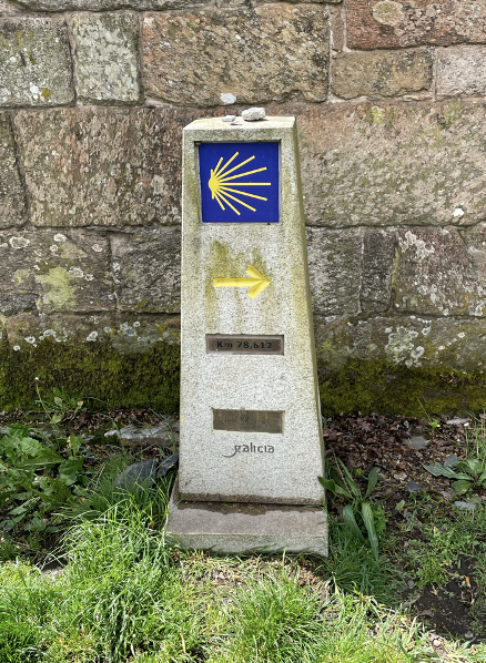 In case you are not familiar with it, the Camino de Santiago is a network of “ways” which all (except one) lead to the Cathedral in Santiago de Compostela in northwestern Spain, the burial place of St James. Pilgrimages on the Camino are thought to date back to as early as the 9th century. The most popular one is called “The French Way,” which begins in Saint-Pied-de-Port in France and extends about 800 km (nearly 500 miles) to Santiago. The “Camino de Finisterre” actually begins in Santiago and ends about 80 km (50 miles) away on a point which at one time was thought to be “the end of the world.” Along the trail, fellow travelers offer each other greetings of “Buen Camino!”, wishing each other a “good way.” Pilgrims carry a small booklet, which is stamped along the way at chapels, restaurants, and hostels to prove the pilgrim’s time on the trail. Upon arrival at the Cathedral in Santiago, each pilgrim who has traveled at least 100 km receives their coveted “Compostela” certificate.