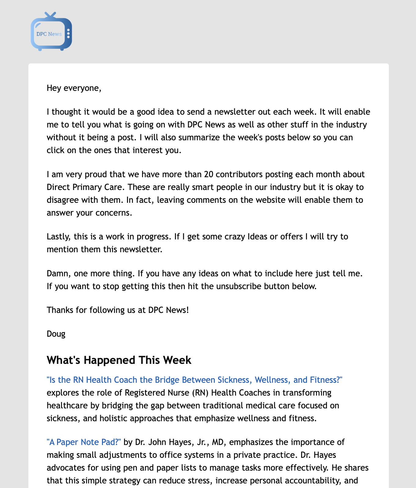 After doing this blog for years I have decided to do a weekly or biweekly newsletter. You may not care or want to know why but I’ll tell you anyway. I want to be able to say things in a non-blog post, formal manner. There are quick tidbits that I want to share about DPC. There are some great posts during the past week I want to highlight. There are times I want to criticize the AAFP in another format. There are other controversial things I want to bring up that will definitely cause some friction. Will I make money from this newsletter? Of course not. We don’t make any money from DPC News. We do put up some ads and sponsored posts on DPCN but this just covers the cost of running things. So, this is NOT a money play.